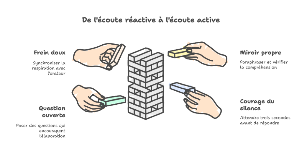 9h31. Salle de réunion, gobelets encore tièdes. Autour de la table, ça parle fort et vite. Mon corps veut entrer en mêlée. J’ai posé le stylo, relâché la mâchoire… et je me suis donné une mission : écouter. Pas pour attendre mon tour de parler. Pour comprendre. Au bout de trente secondes, quelque chose bascule : les muscles du front se lissent, les phrases d’en face gagnent des nuances, l’air devient respirable.