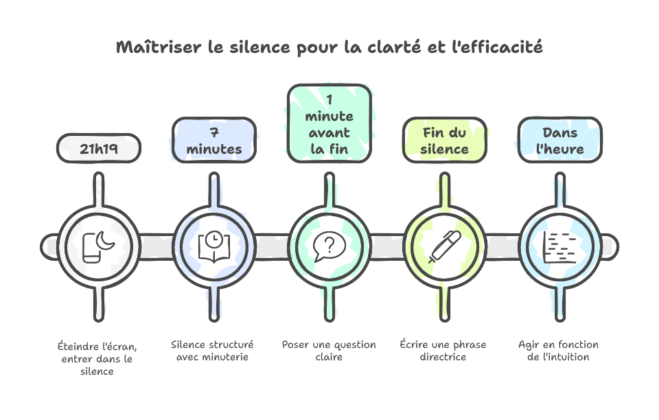 21h19. J’éteins l’écran : le bruit s’arrête d’un coup, presque trop. Je m’assois, paumes ouvertes, dos contre la chaise. Le silence n’est pas une absence ; c’est un instrument. Quand je le laisse m’accorder, la décision juste remonte, nue, sans effets spéciaux.