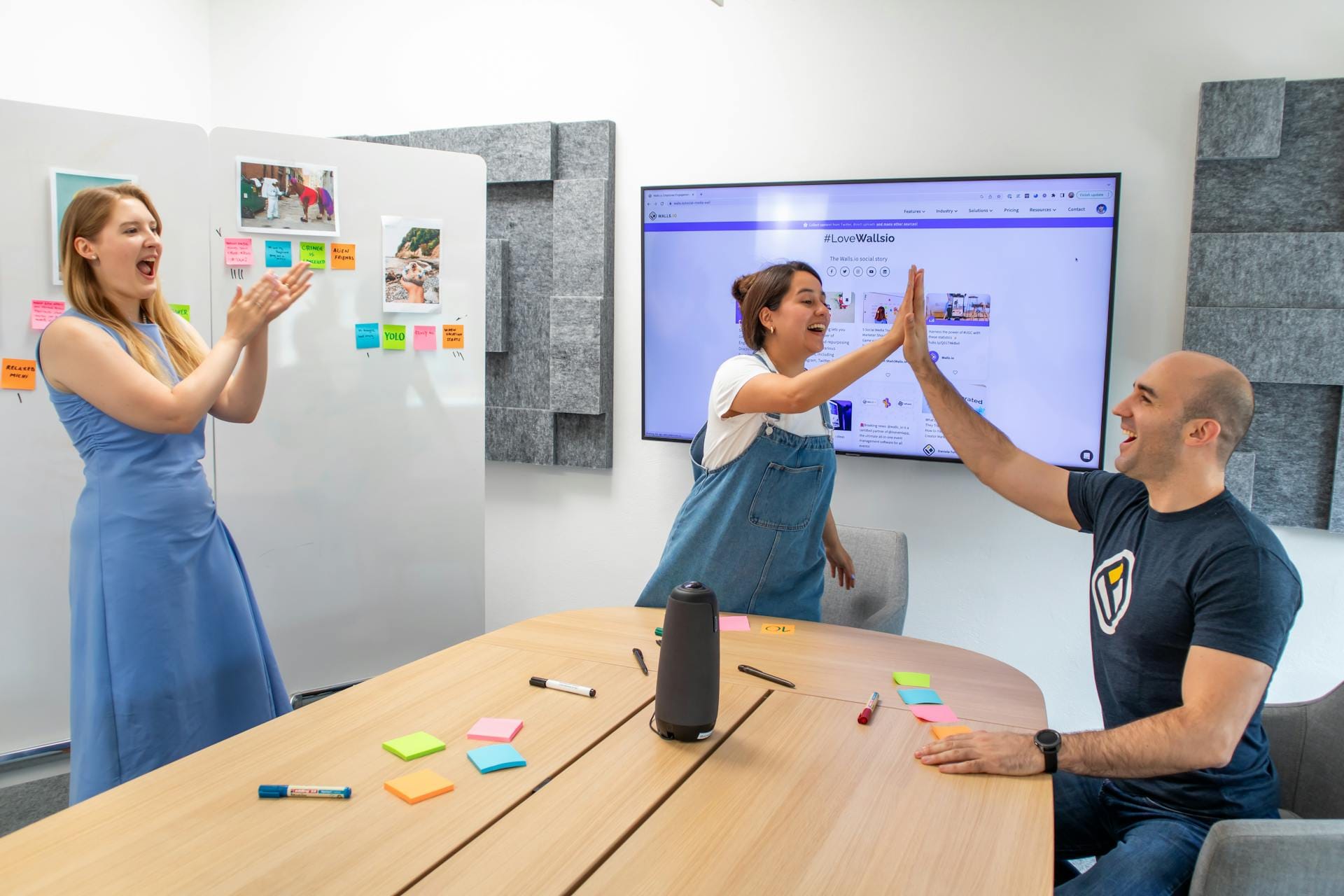 Réunion collaborative avec tableau et écran interactif.